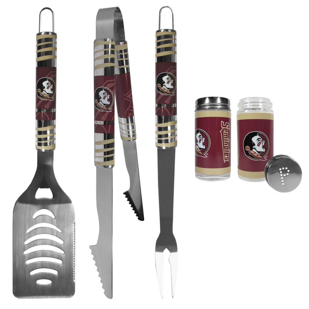The eye-catching chrome graphics on this set make it a game day favorite! The high-quality, 420 grade stainless steel 3 pc Florida State Seminoles BBQ grill set will make any grill master smile. These barbeque tools are made to last and the tool set includes a large spatula with a bottle opener feature and sharp serrated edge, strong tongs and fork. The 16 inch length keeps you far from the flames. Add in our classic salt and pepper shakers and you’re ready for any game day event! The diner replica salt and pepper shakers are glass with screw top lids and team graphics on the front.