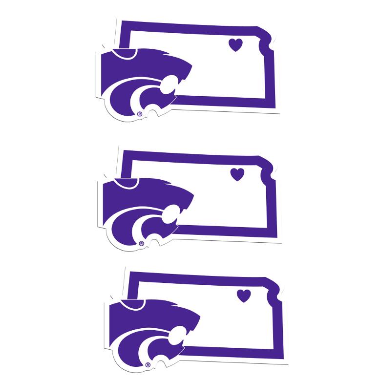 It's a home state decal with a sporty twist! This Kansas St. Wildcats decal feature the team logo over a silhouette of the state in team colors and a heart marking the home of the team. The decal is approximately 5 inches on low tack vinyl.