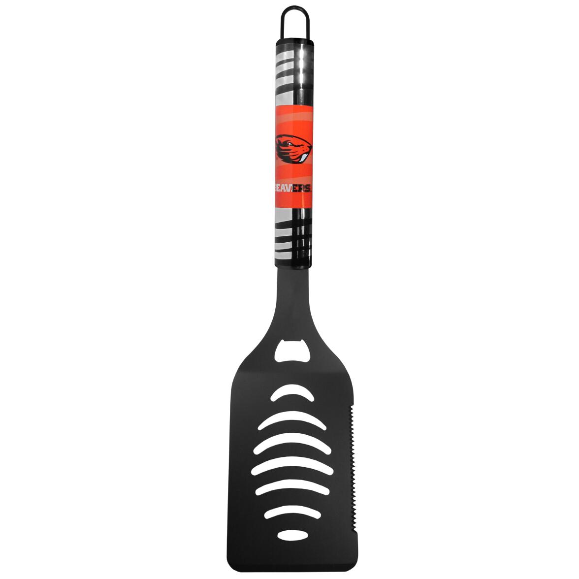 Our tailgater spatula really catches your eye with team color and chrome accents and Oregon St. Beavers digital graphics. The 440 grade stainless steel spatula is a tough, heavy-duty tool that will last through years of tailgating fun. The spatula features a bottle opener and sharp serrated edge and comes with a matte black finish.