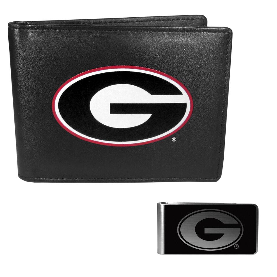 Sports fans do not have to sacrifice style with this classic bi-fold wallet that sports the Georgia Bulldogs extra large logo. This men's fashion accessory has a leather grain look and expert craftmanship for a quality wallet at a great price. The wallet features inner credit card slots, windowed ID slot and a large billfold pocket. The wallet comes with separate steel money clip with a classic black & metal finish.