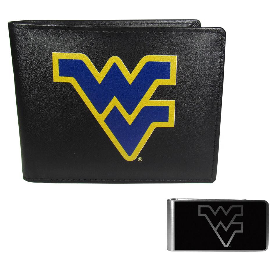 Sports fans do not have to sacrifice style with this classic bi-fold wallet that sports the West Virginia Mountaineers extra large logo. This men's fashion accessory has a leather grain look and expert craftmanship for a quality wallet at a great price. The wallet features inner credit card slots, windowed ID slot and a large billfold pocket. The wallet comes with separate steel money clip with a classic black & metal finish.