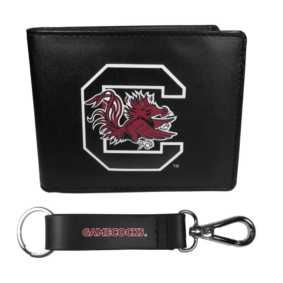 Sports fans do not have to sacrifice style with this classic bi-fold wallet that sports the South Carolina Gamecocks extra large logo. This men's fashion accessory has a leather grain look and expert craftmanship for a quality wallet at a great price. The wallet features inner credit card slots, windowed ID slot and a large billfold pocket. Comes with a stylish black strap key chain with clip to easily attach to belts, backpacks or purses.