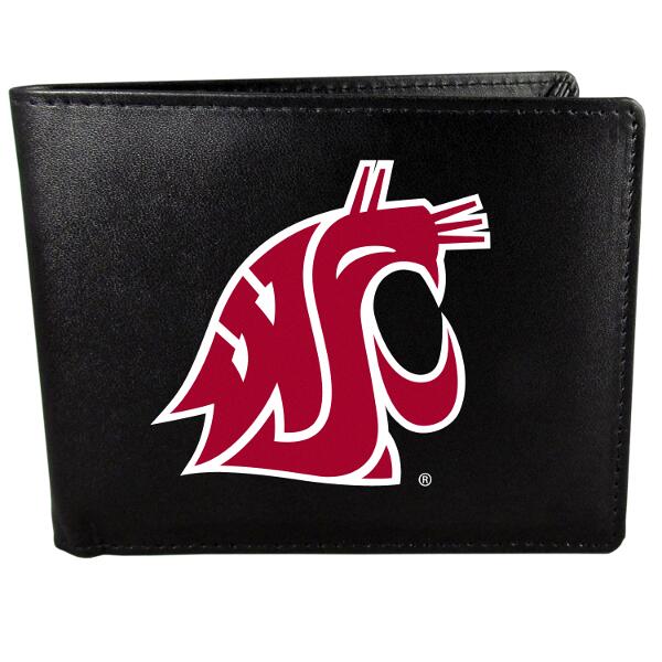 Sports fans do not have to sacrifice style with this classic bi-fold wallet that sports the Washington St. Cougars extra large logo. This men's fashion accessory has a leather grain look and expert craftmanship for a quality wallet at a great price. The wallet features inner credit card slots, windowed ID slot and a large billfold pocket. The front of the wallet features a printed team logo.