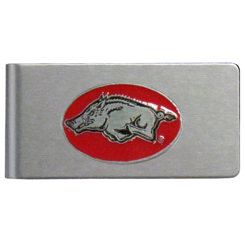 Our brushed metal money clip has classic style and functionality. The attractive clip features a metal Arkansas Razorbacks emblem with expertly enameled detail.