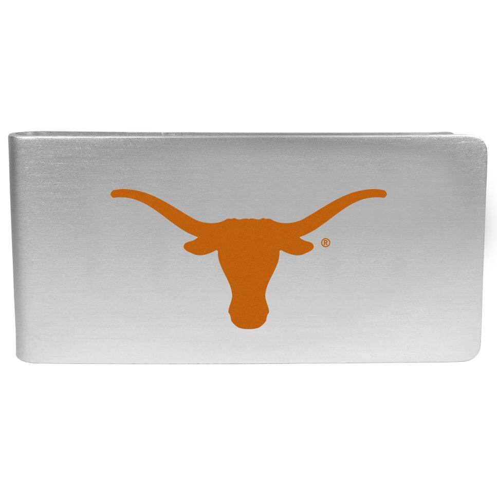 Our brushed metal money clip has classic style and functionality. The attractive clip features the Texas Longhorns logo expertly printed on front.