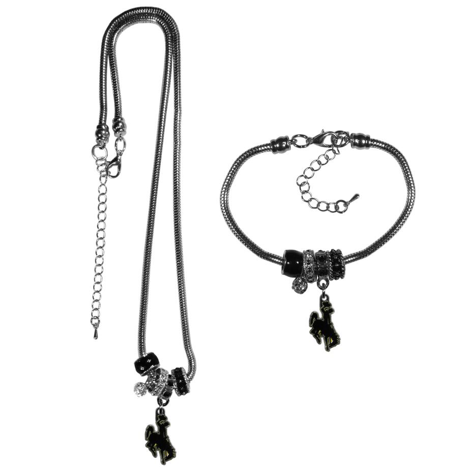 This must-have Wyoming Cowboys look features the wildly popular euro bead style teamed with eye catching team charms. This set comes with a fashionable snake chain bracelet and 18 inch necklace both featuring a variety of team colored euro beads and rhinestone beads for classy look that outshines the average fan jewelry. This high quality set is great for game-day but a fan's going to want to show off this set everyday!