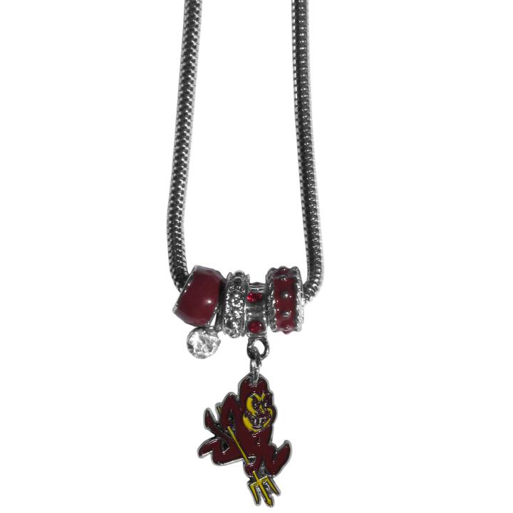 We have combined the wildly popular Euro style beads with your favorite team to create our Arizona State Sun Devils bead necklace. The 18 inch snake chain features 4 Euro beads with enameled team colors and rhinestone accents with a high polish, nickel free charm and rhinestone charm. Perfect way to show off your team pride.