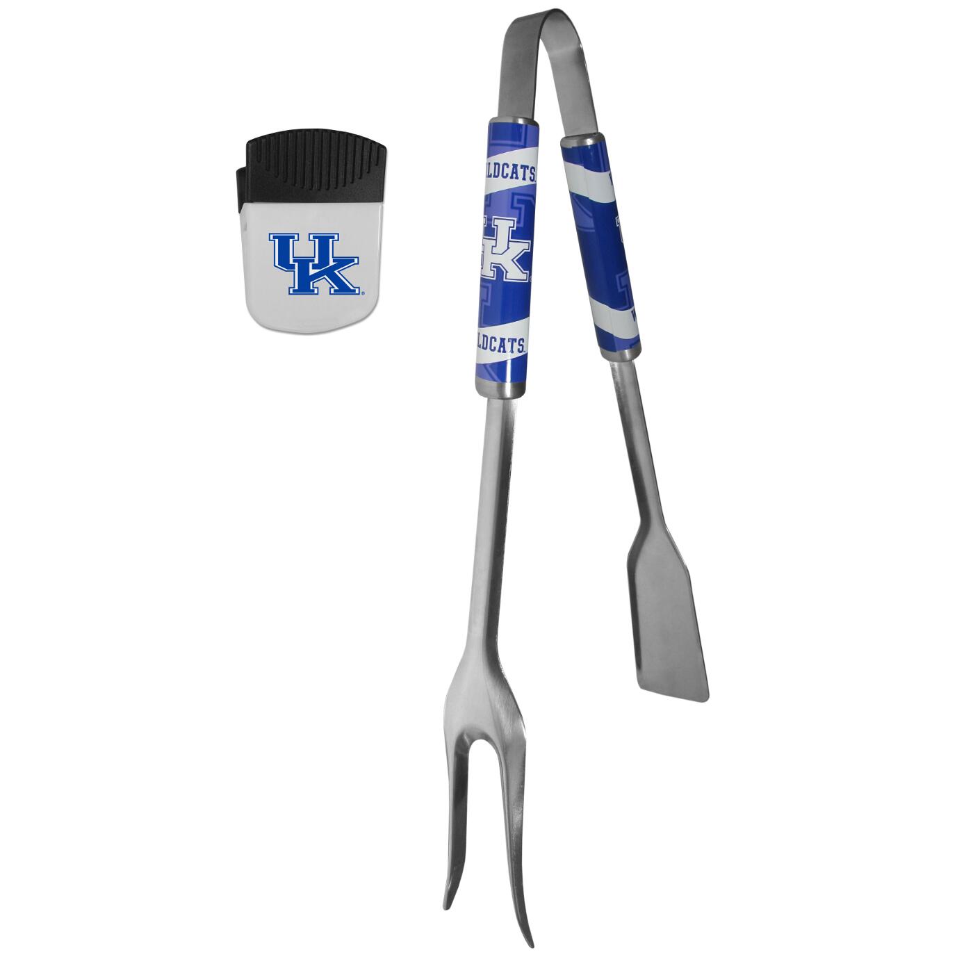 The perfect space saving tool! This stainless steel grilling tool is a spatula, tongs and fork all in one high-quality BBQ tool. The tool features bright Kentucky Wildcats graphics. Comes with an attractive clip magnet to hold memos, photos or appointment cards on the fridge or take it down keep use it to clip bags shut. The chip clip magnet features a large team logo.