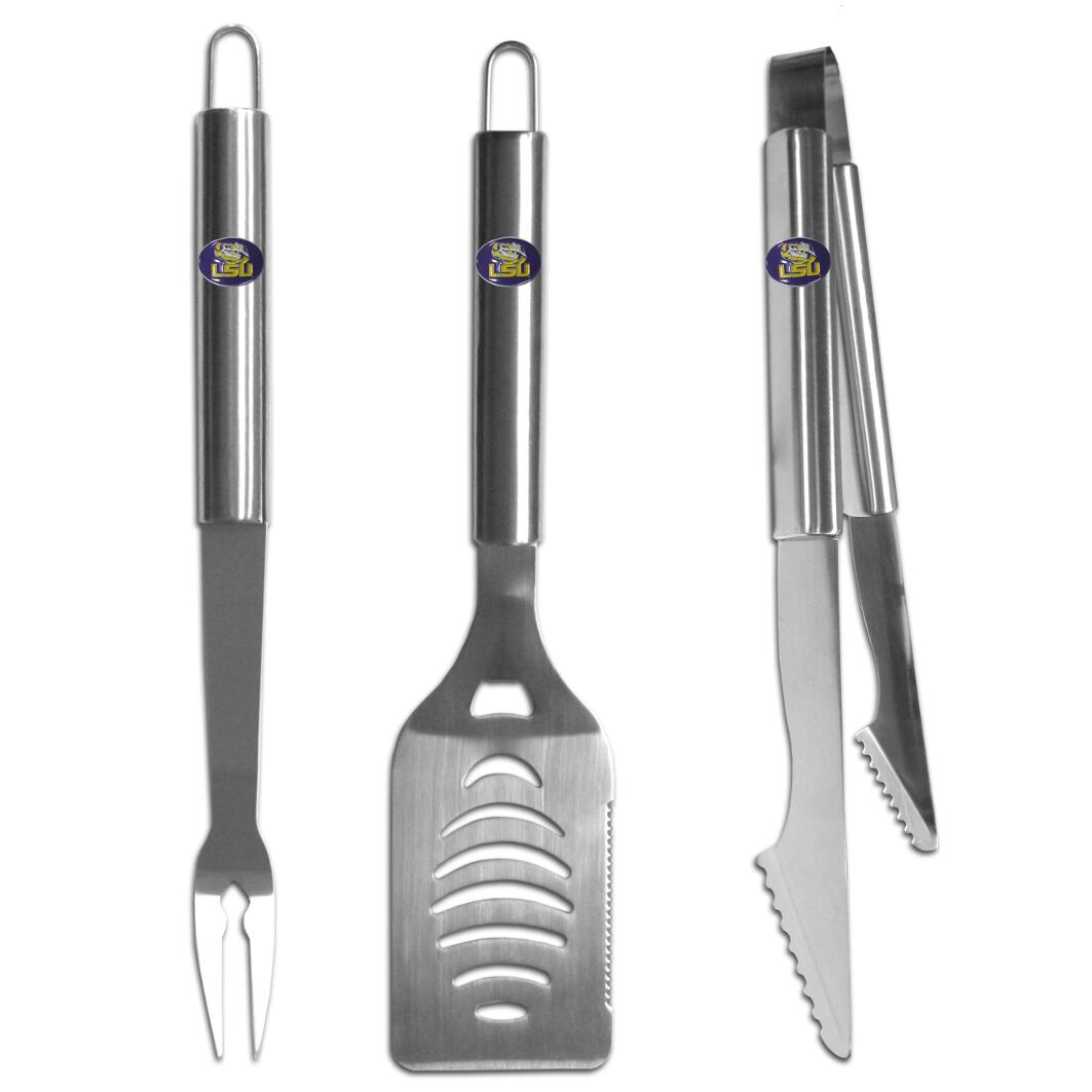 Our LSU Tigers stainless steel 3 pc BBQ tool set includes a large spatula with built in bottle opener, heavy duty tongs, and large fork. All the tools feature a team logo on the handle.