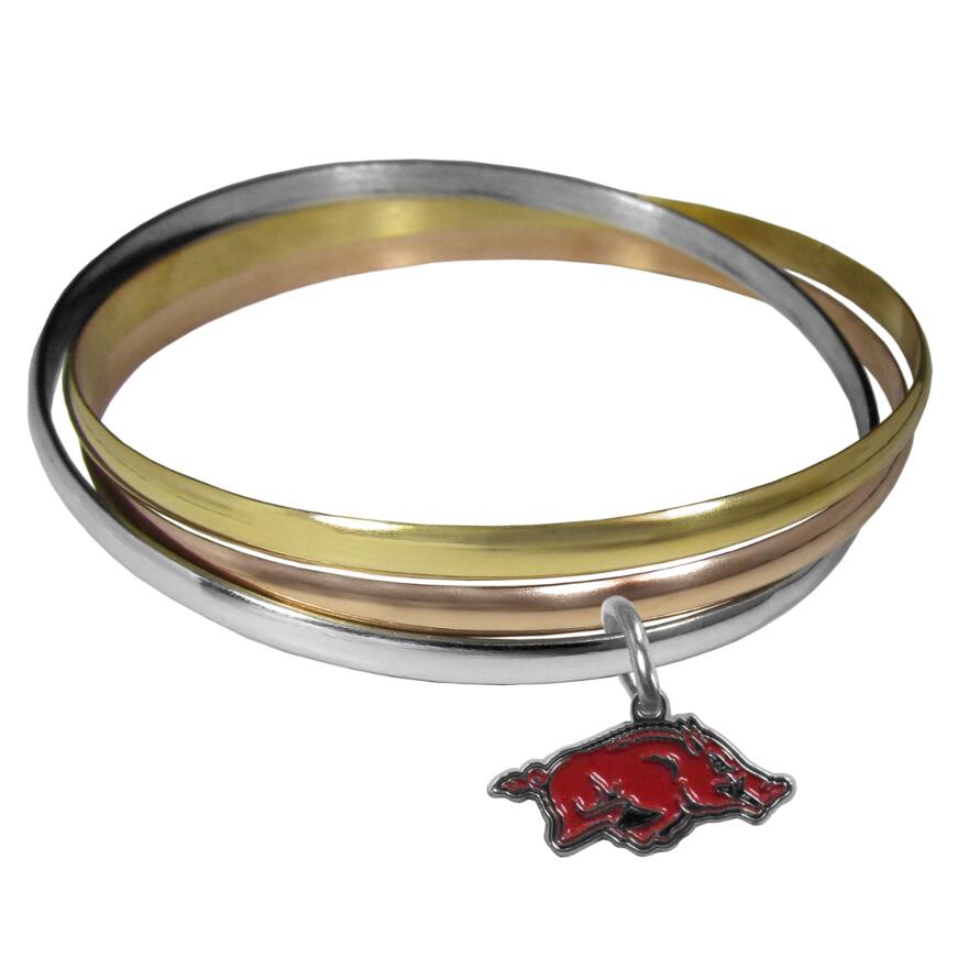 These beautiful bangles come in a interlocking style and feature a fully cast Arkansas Razorbacks charm with enameled team colors. The bracelet has a silver toned bangle, gold tone bangle and brass toned bangle.