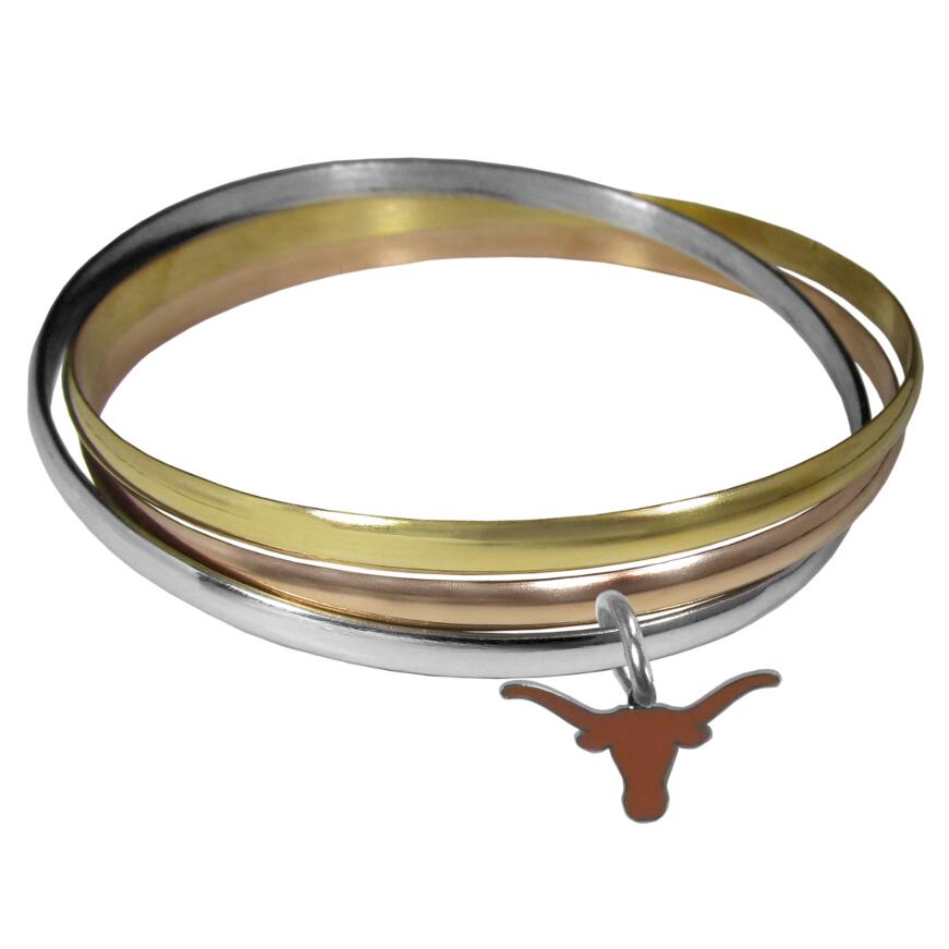 These beautiful bangles come in a interlocking style and feature a fully cast Texas Longhorns charm with enameled team colors. The bracelet has a silver toned bangle, gold tone bangle and brass toned bangle.