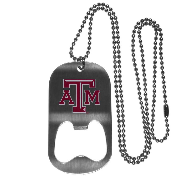 Our Texas A&M Aggies bottle opener tag necklace has a brushed metal finish and inlaid team logo. The pendant has bottle opener feature and comes on a 20 inch ball chain making the perfect game day accessory!