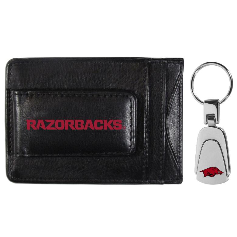 This super slim leather wallet lets you have all the benefits of a money clip while keeping the organization of a wallet. On one side of this front pocket wallet there is a strong, magnetic money clip to keep your cash easily accessible and the Arkansas Razorbacks team logo on the front. Comes with a stylish steel teardrop key chain that features the team logo printed on the front and a high polish chrome finish on the back.