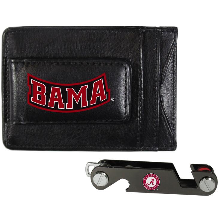 This super slim leather wallet lets you have all the benefits of a money clip while keeping the organization of a wallet. On one side of this front pocket wallet there is a strong, magnetic money clip to keep your cash easily accessible and the Alabama Crimson Tide team logo on the front. Comes with our innovative key organizer that stores your keys in a compact, easy to access bundle with Swiss style engineering. You can load up to 10 keys that zipper back into the organizer so that you never have to deal with keys poking you in your pocket, damaging your purse or simply creating a ton of noise. There is a handy loop piece to attach your larger car key or fob.