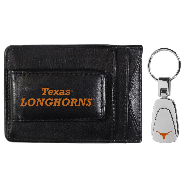This super slim leather wallet lets you have all the benefits of a money clip while keeping the organization of a wallet. On one side of this front pocket wallet there is a strong, magnetic money clip to keep your cash easily accessible and the Texas Longhorns team logo on the front. Comes with a stylish steel teardrop key chain that features the team logo printed on the front and a high polish chrome finish on the back.