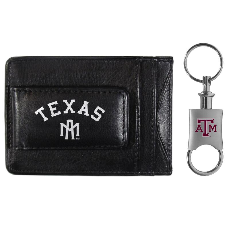 This super slim leather wallet lets you have all the benefits of a money clip while keeping the organization of a wallet. On one side of this front pocket wallet there is a strong, magnetic money clip to keep your cash easily accessible and the Texas A&M Aggies team logo on the front. Comes with a high-quality steel valet key chain. The key chain features to rings, one that easily detaches to easily for the valet to use so you do not have to risk giving out all of your keys.