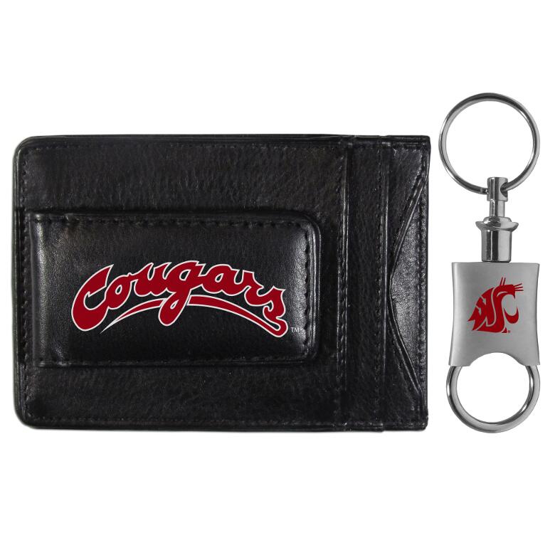 This super slim leather wallet lets you have all the benefits of a money clip while keeping the organization of a wallet. On one side of this front pocket wallet there is a strong, magnetic money clip to keep your cash easily accessible and the Washington St. Cougars team logo on the front. Comes with a high-quality steel valet key chain. The key chain features to rings, one that easily detaches to easily for the valet to use so you do not have to risk giving out all of your keys.