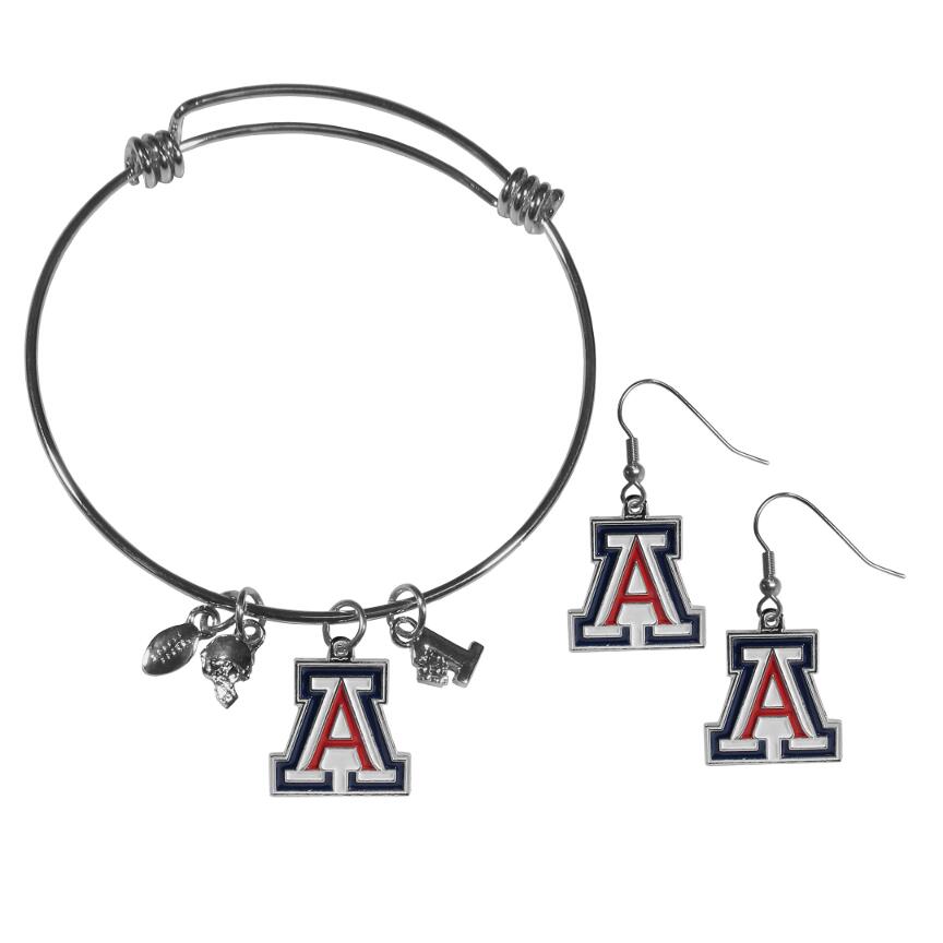 Our trendy Arizona Wildcats charm bangle bracelet is now paired with our most popular dangle earrings for the perfect finish to any fan's outfit. The ajustable wire bracelet with 3 football themed charms and a beautiful team charm that matches the team charm on the earrings. The earrings have hypoallergenic, steel fishhook posts.
