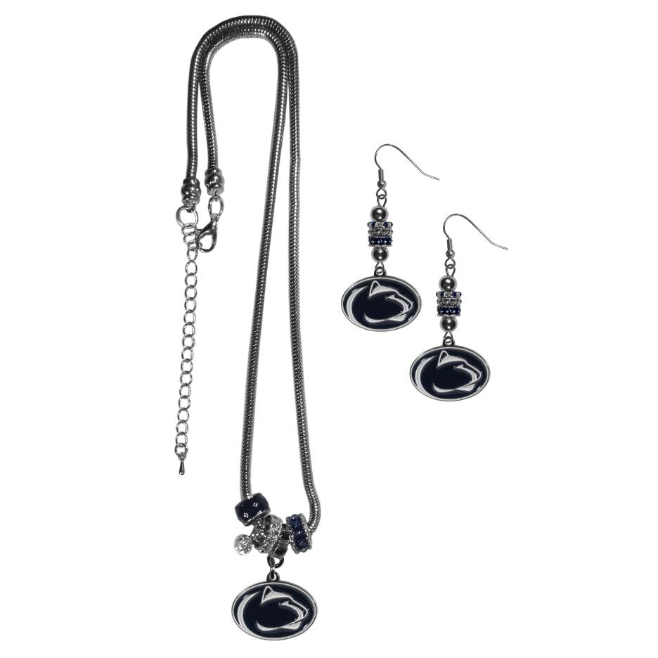 This must-have Penn St. Nittany Lions look features the wildly popular euro bead style teamed with eye catching team charms. The 18 inch, snake chain necklace is paired with delicate matching earrings with hypoallergenic, steel fishhook posts.