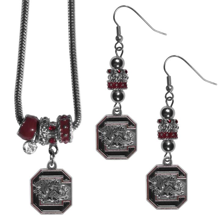 This must-have South Carolina Gamecocks look features the wildly popular euro bead style teamed with eye catching team charms. The 18 inch, snake chain necklace is paired with delicate matching earrings with hypoallergenic, steel fishhook posts.