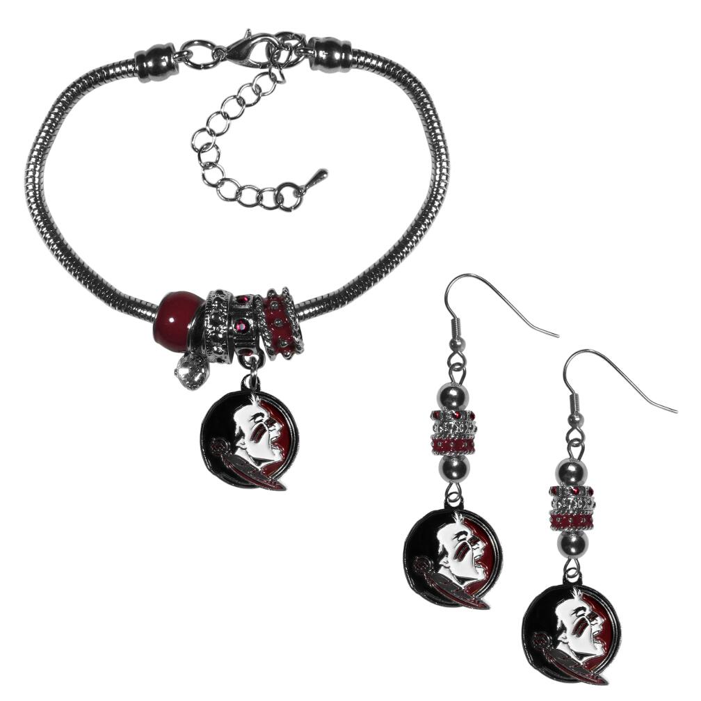 We combine the popular Euro bead style with your love of the Florida State Seminoles with this beautiful jewelry set that includes earrings and a matching bracelet. The stylish earrings feature hypoallergenic, nickel free fishhook posts and 3 team colored Euro beads and a metal team charm. The matching snake chain bracelet is 7.5 inches long with a 2 inch extender and 4 Euro beads with a rhinestone charm and team charm.