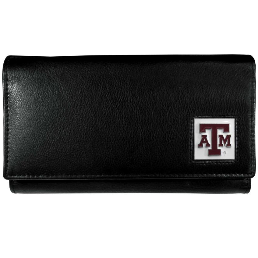 This genuine leather women's pocketbook features 9 credit card slots, a windowed ID slot, spacious front pocket, inner pocket and zippered coin pocket. The front of the pocketbook has a hand painted metal square with the Texas A&M Aggies primary logo.