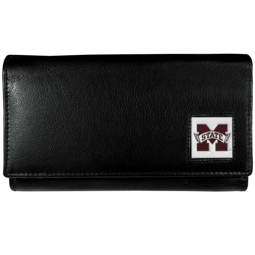 This genuine leather women's pocketbook features 9 credit card slots, a windowed ID slot, spacious front pocket, inner pocket and zippered coin pocket. The front of the pocketbook has a hand painted metal square with the Mississippi St. Bulldogs primary logo.