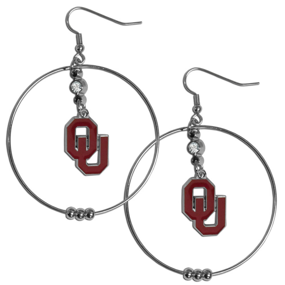 Our large hoop earrings have a fully cast and enameled Oklahoma Sooners charm with enameled detail and a high polish nickel free chrome finish and rhinestone access. Hypoallergenic fishhook posts.