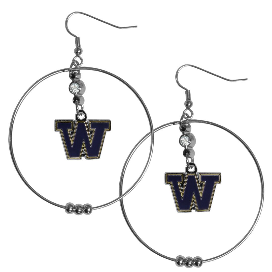 Our large hoop earrings have a fully cast and enameled Washington Huskies charm with enameled detail and a high polish nickel free chrome finish and rhinestone access. Hypoallergenic fishhook posts.