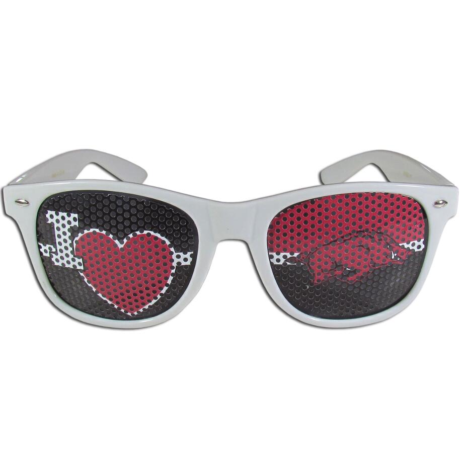 Our officially licensed I Heart game day shades are the perfect accessory for the devoted Arkansas Razorbacks fan! The sunglasses have durable polycarbonate frames with flex hinges for comfort and damage resistance. The lenses feature brightly colored team clings that are perforated for visibility.