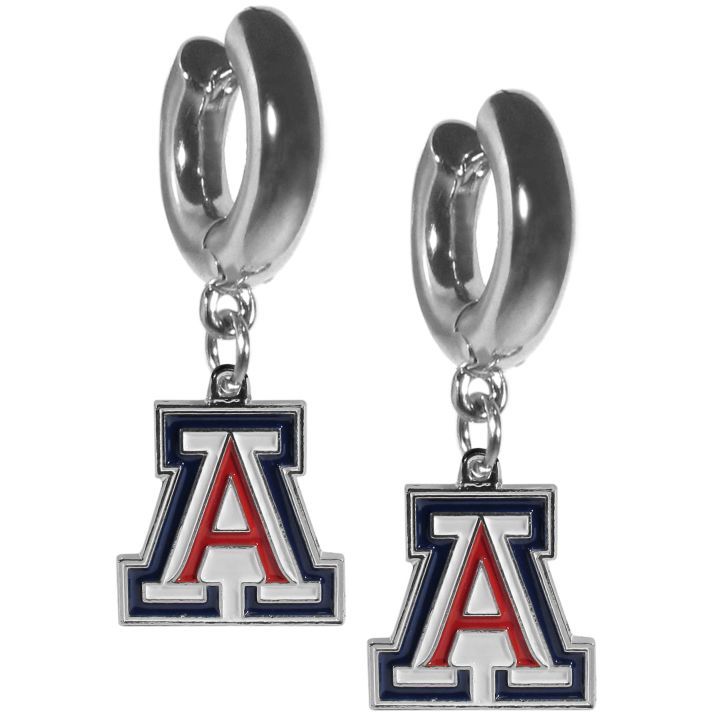 Our Arizona Wildcats huggie hoop earrings have a classic style with a sporty twist. The chunky hoop is 3/4 inch diameter and 1/4 inch thickness with a fully cast metal team charm. The simple lock clasp on the earrings makes them very secure during all types of activity.