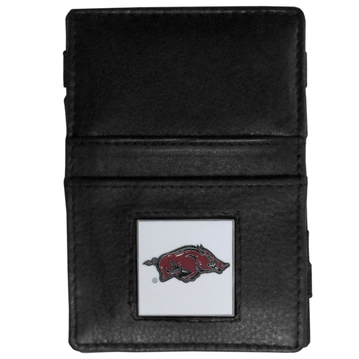 This officially licensed, innovative jacob's ladder wallet design traps cash with just a simple flip of the wallet! There are also outer pockets to store your ID and credit cards. The wallet is made of fine quality leather with a fully cast & enameled Arkansas Razorbacks emblem on the front.