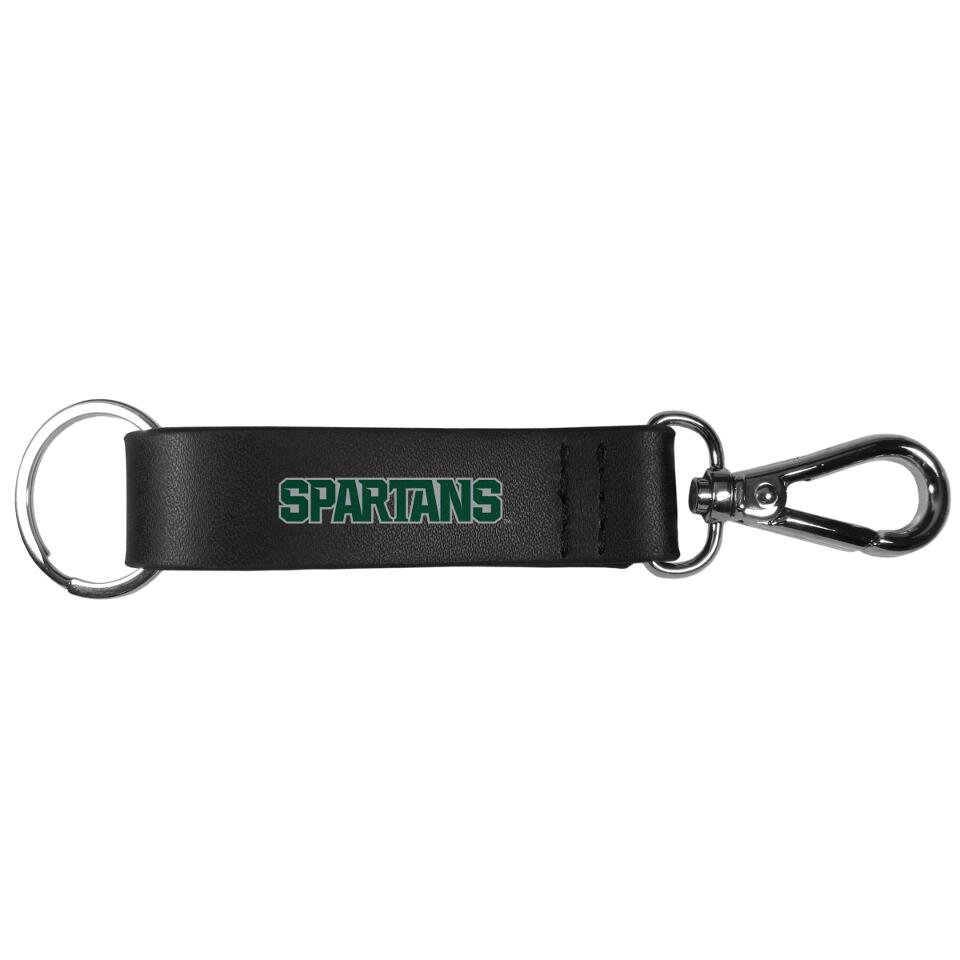 This stylish key chain features a spring clasp at one end of the chunky black strap and a standard split ring at the other. The leather like textured strap features an expertly printed Michigan St. Spartans wordmark. The key chain can be easily clipped to purses, backpacks or belt loops to make it easier to find your keys.