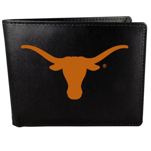 Our classic fine leather bi-fold wallet is meticulously crafted with genuine leather that will age beautifully so you will have a quality wallet for years to come. The wallet opens to a large, billfold pocket and numerous credit card slots. The front of the wallet features an extra large Texas Longhorns printed logo.