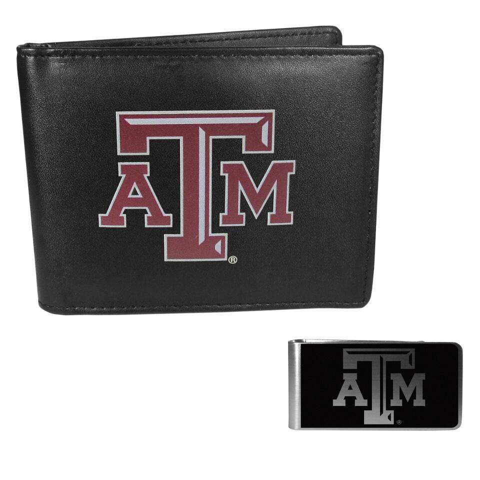 Our classic fine leather bi-fold wallet is meticulously crafted with genuine leather that will age beautifully so you will have a quality wallet for years to come. The wallet opens to a large, billfold pocket and numerous credit card slots and has a convenient windowed ID slot. The front of the wallet features an extra large Texas A&M Aggies printed logo. Comes with separate steel money clip with a classic black & metal finish.