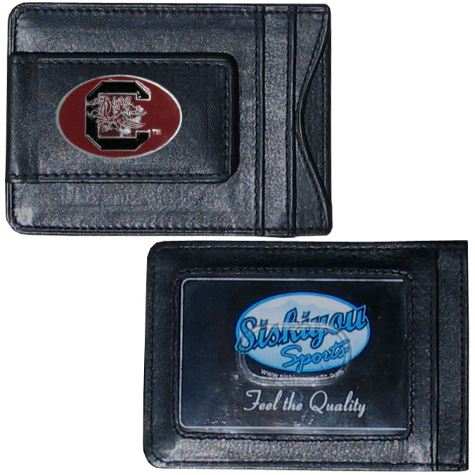 Our South Carolina Gamecocks genuine leather cash & cardholder is a great alternative to the traditional bulky wallet. This compact wallet has credit card slots, windowed ID slot and a magnetic money clip that will not damage your credit cards. The wallet features a metal team emblem.