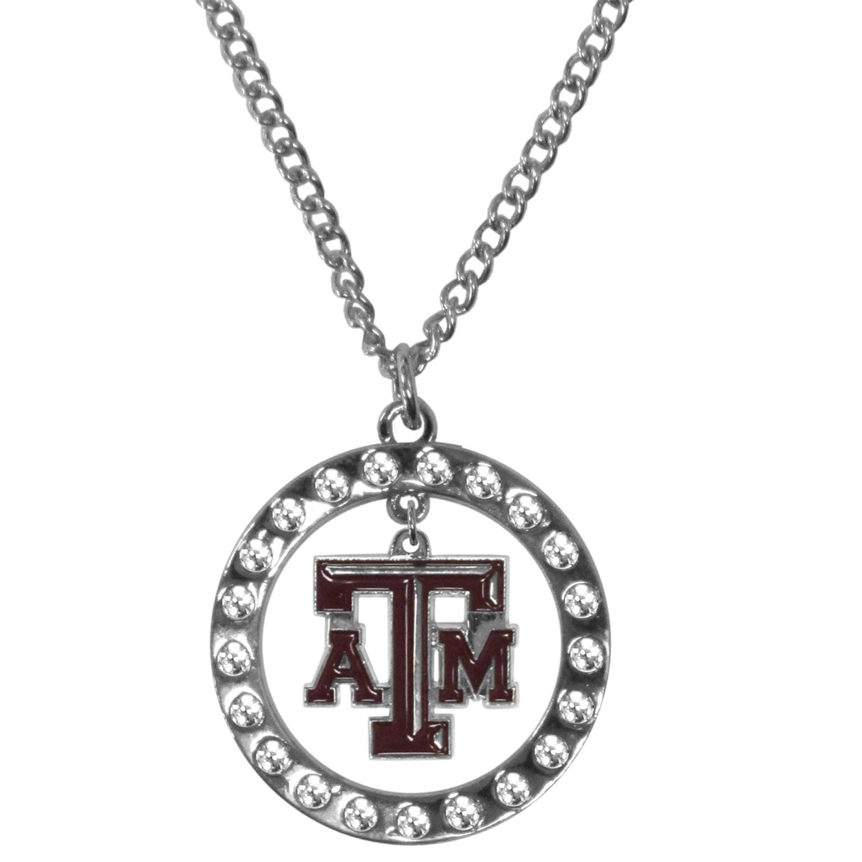 Our Texas A&M Aggies rhinestone hoop necklace comes on an 18 inch chain and features a hoop covered in rhinestones with a high polish chrome finish and a cast and enameled team charm dangling in the center.