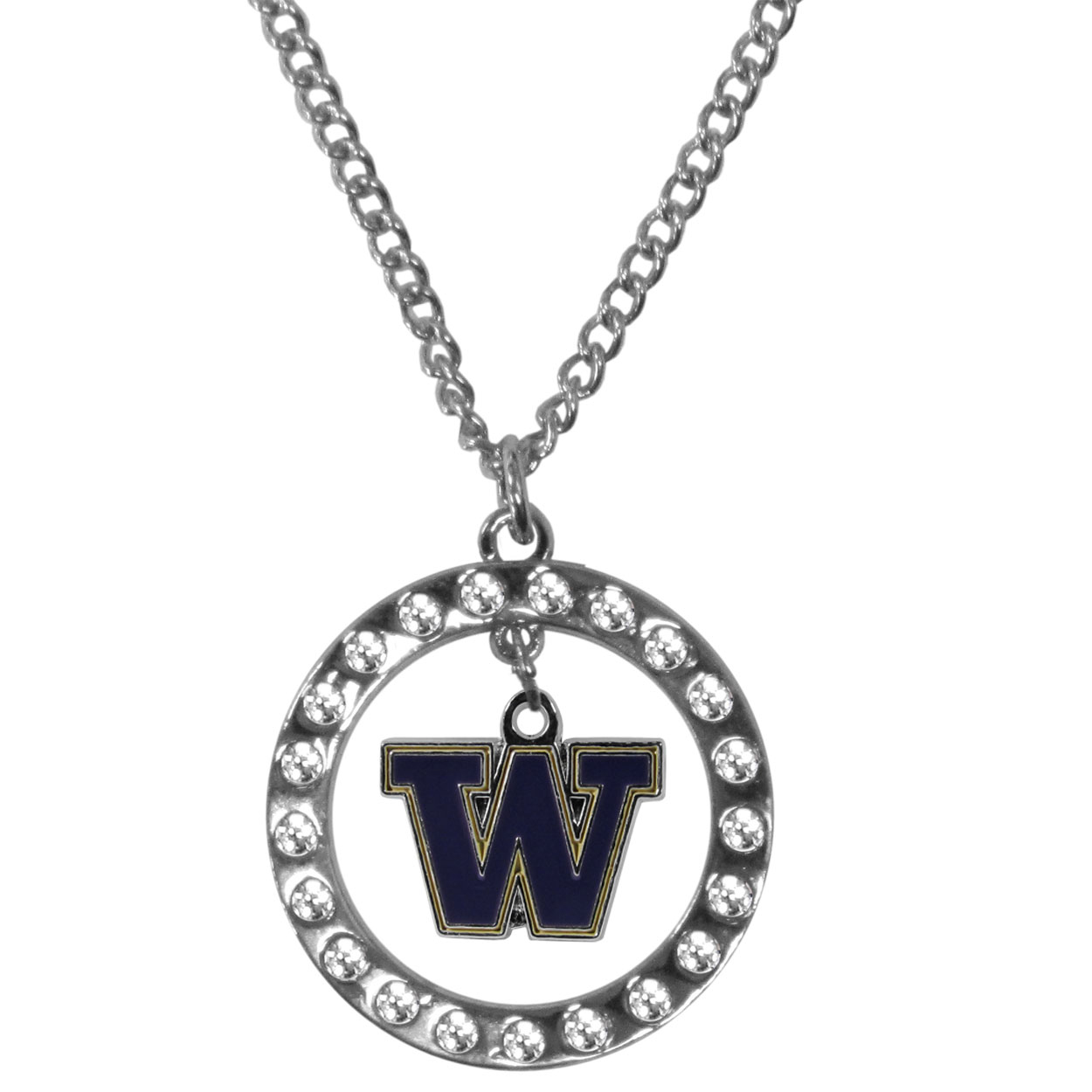 Our Washington Huskies rhinestone hoop necklace comes on an 18 inch chain and features a hoop covered in rhinestones with a high polish chrome finish and a cast and enameled team charm dangling in the center.