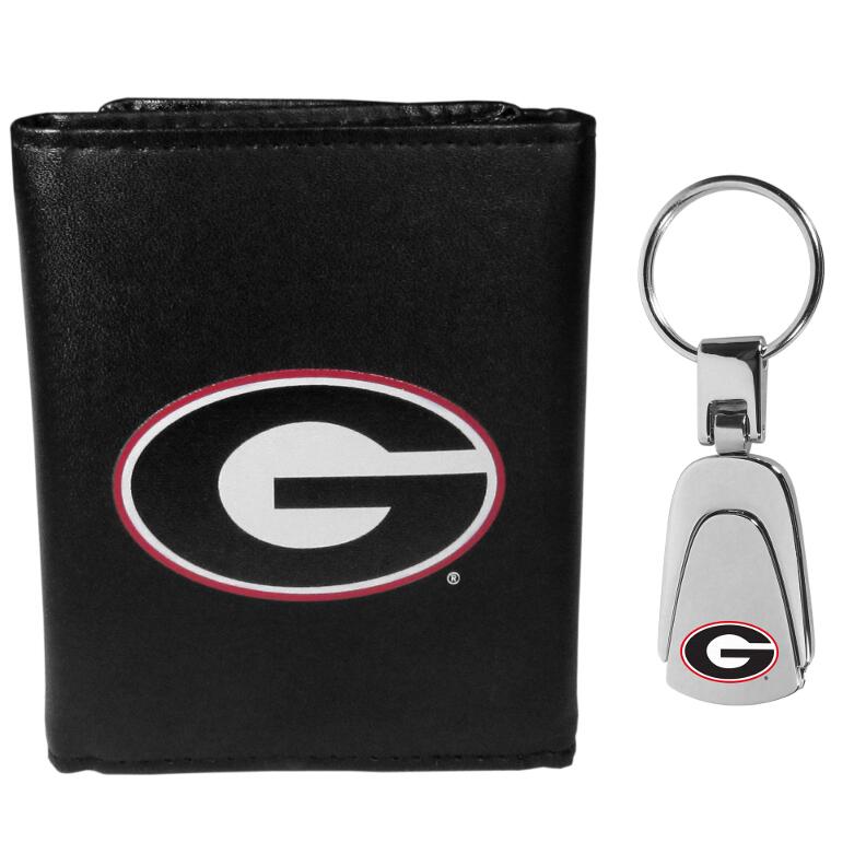 Our classic fine leather tri-fold wallet is meticulously crafted with genuine leather that will age beautifully so you will have a quality wallet for years to come. This is fan apparel at its finest. The wallet is packed with organizational features; lots of credit card slots, large billfold pocket, and a window ID slot. The front of the wallet features an extra large Georgia Bulldogs printed logo. Comes with a stylish steel teardrop key chain that features the team logo printed on the front and a high polish chrome finish on the back.