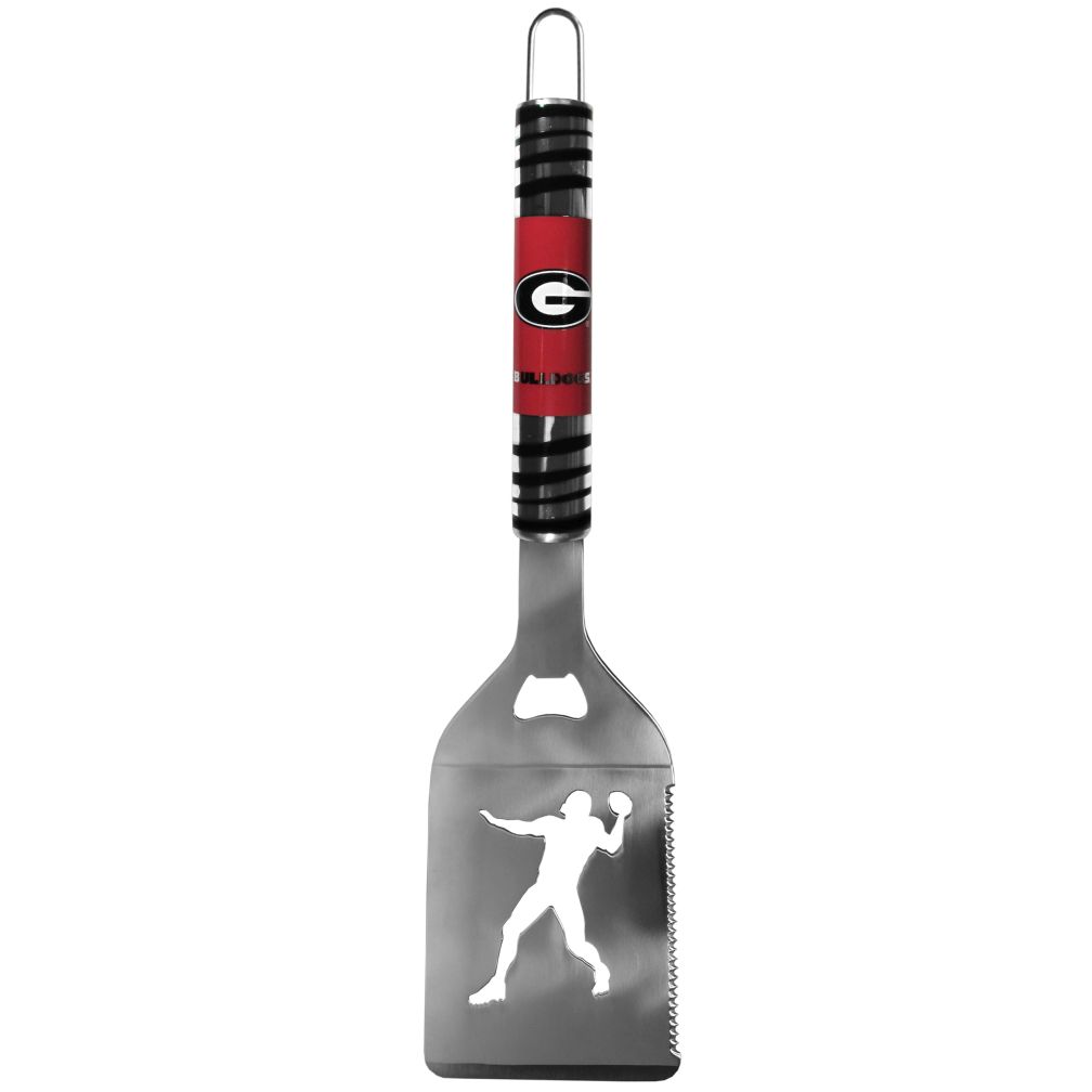 Our tailgater spatula really catches your eye with flashy chrome accents and vivid Georgia Bulldogs digital graphics. The 430 grade stainless steel spatula is a tough, heavy-duty tool that will last through years of tailgating fun. The spatula features a bottle opener and sharp serrated edge.