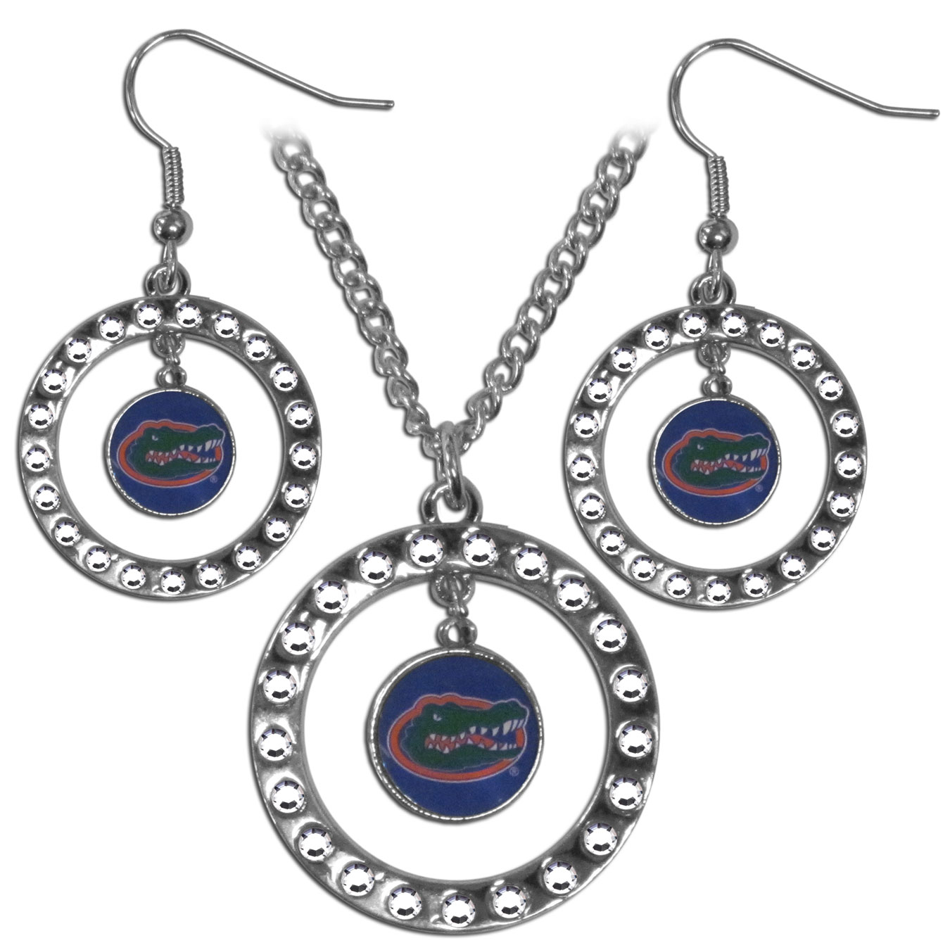 This officially licensed Florida Gators jewelry set includes our rhinestone hoop earrings and pendant in a gift box. The 1 inch rhinestone hoop pendant comes on an 18 inch chain and is paired with the matching dangle hoop earrings.