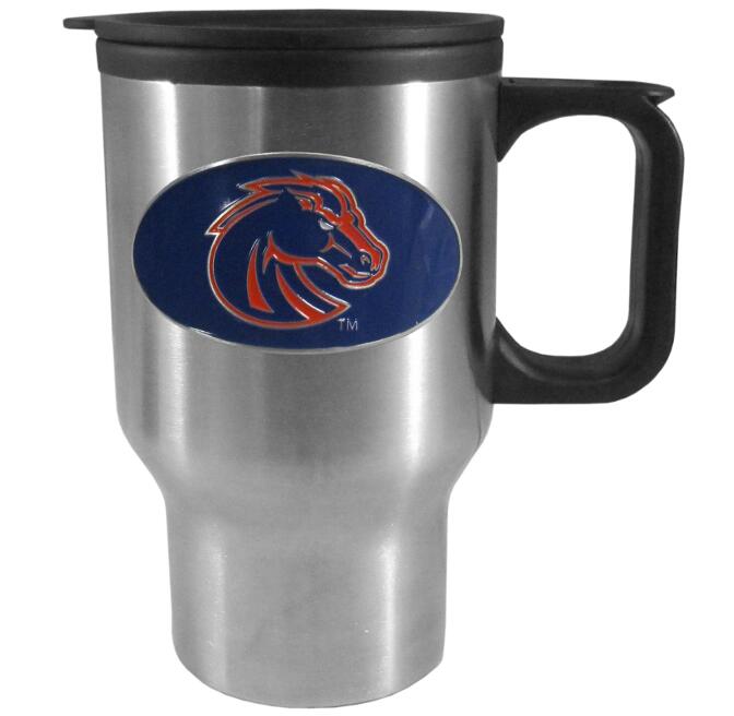 Our stainless steel scultped travel mugs have a secure lid that easily pops off using the side thumb brace. The 14 ounce capacity mug features a metal Boise State Broncos emblem.