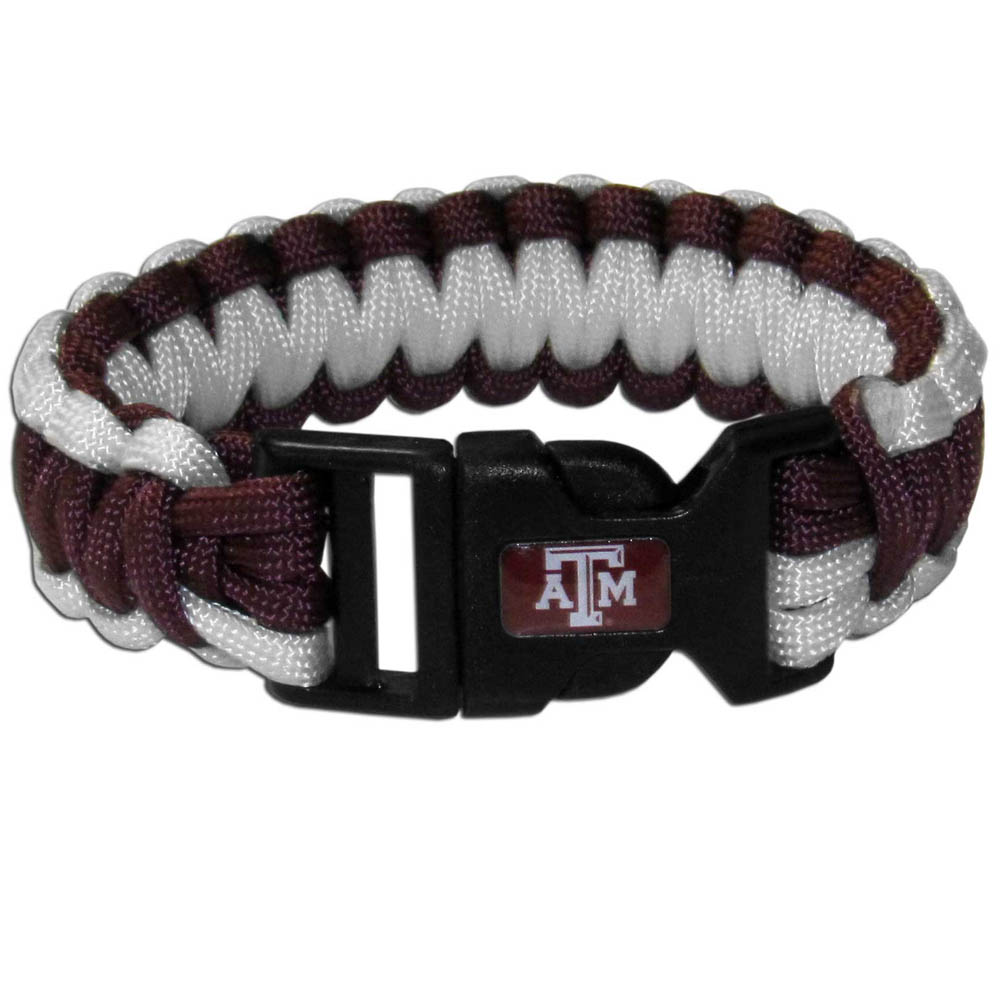 Our functional and fashionable Texas A&M Aggies survivor bracelets contain 2 individual 300lb test paracord rated cords that are each 5 feet long. The team colored cords can be pulled apart to be used in any number of emergencies and look great while worn. The bracelet features a team emblem on the clasp.