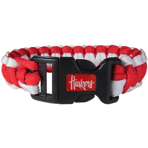Our functional and fashionable Nebraska Cornhuskers survivor bracelets contain 2 individual 300lb test paracord rated cords that are each 5 feet long. The team colored cords can be pulled apart to be used in any number of emergencies and look great while worn. The bracelet features a team emblem on the clasp.