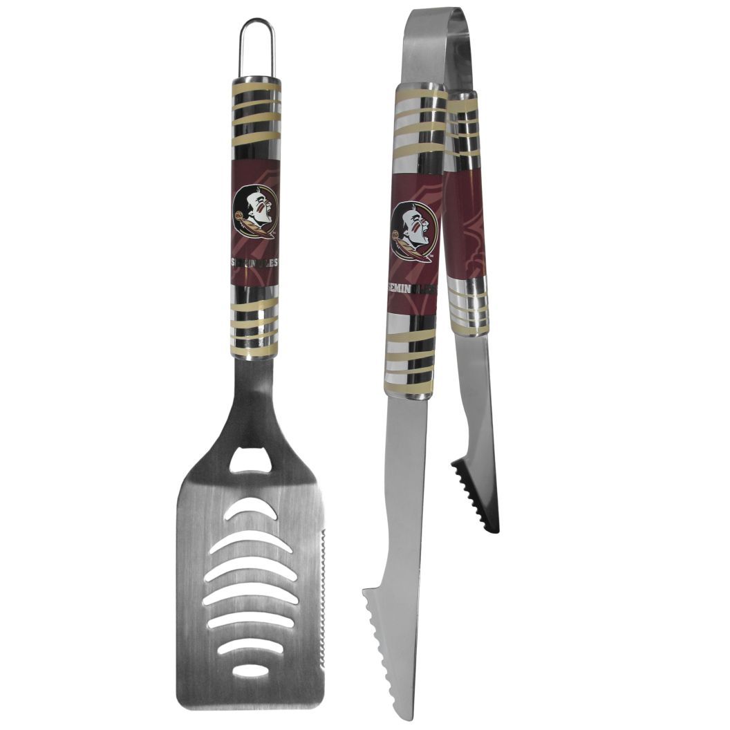 The eye-catching team color and chrome graphics on this set make it a game day favorite! The high-quality, 2 pc Florida State Seminoles grill set will make any grill master smile. These barbeque tools are made to last whether you are using them for camping, tailgating or a patio party you will have quality grill tools for years to come. The set includes a large spatula with a bottle opener feature and sharp serrated edge and strong tongs with curved edges for extra grip both with a matte black finish. The 17 inch length keeps you far from the flames. The quality of the tools make them a great choice for Father's Day or Christmas gifts, they are really a grill accessory must have.