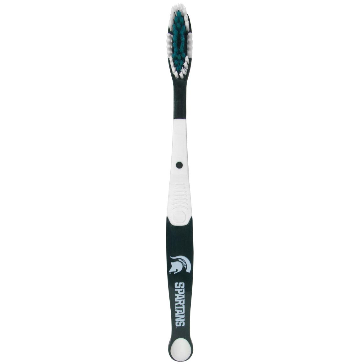 Why have a boring old toothbrush when you can have the MVP of toothbrushes! This cool Michigan St. Spartans toothbrush features crisp team graphics on a team colored toothbrush. This is no simple novelty item though, it is a high-quality hygiene device with soft bristles for a gentle clean and rubber gum massagers on the sides of the bristles.