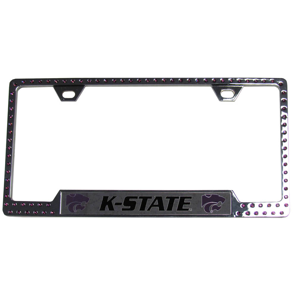 Our bling tag frame are the perfect balance of chrome and glitz. The chrome tag frame is framed in crystals with an enameled plate featuring the Kansas St. Wildcats logo and name.