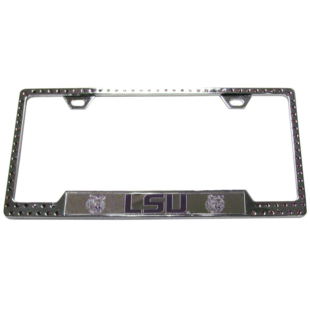 Our bling tag frame are the perfect balance of chrome and glitz. The chrome tag frame is framed in crystals with an enameled plate featuring the LSU Tigers logo and name.