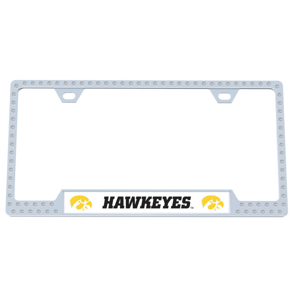 Our bling tag frame are the perfect balance of chrome and glitz. The chrome tag frame is framed in crystals with an enameled plate featuring the Iowa Hawkeyes logo and name.