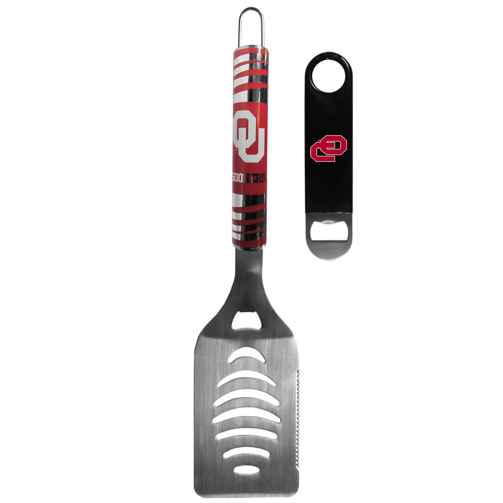 Our tailgater spatula really catches your eye with flashy chrome accents and vivid Oklahoma Sooners digital graphics. The 420 grade stainless steel spatula is a tough, heavy-duty tool that will last through years of tailgating fun. The spatula features a bottle opener and sharp serrated edge. Comes with a heavy-duty steel opener that is extra long, with a durable vinyl covering. The extra length provides more leverage for speed opening and the opener features a large printed team logo.